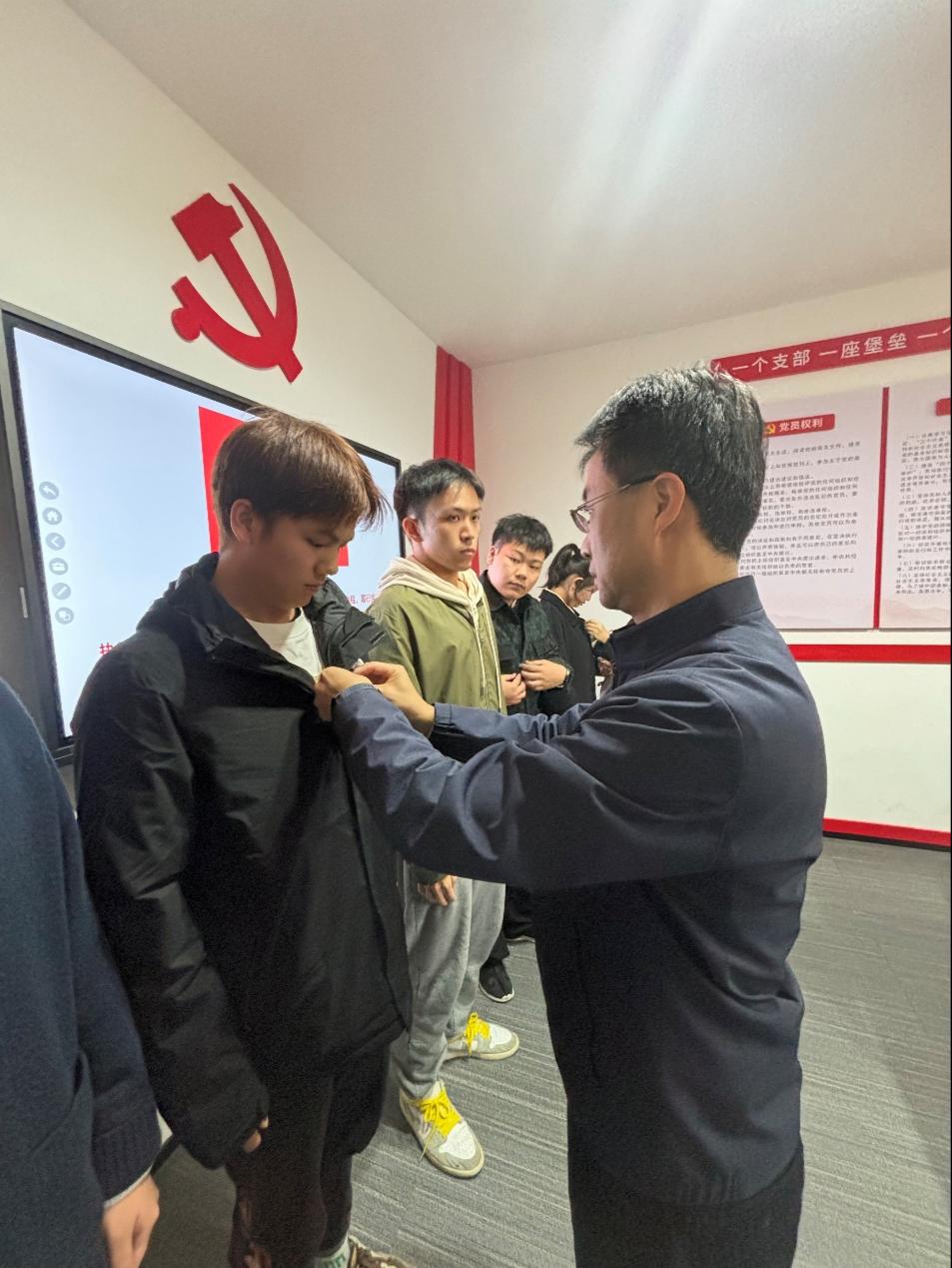 接着,高东波书记依次为预备党员佩戴党徽。