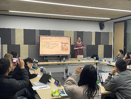 Karen Petrie以“Introduction to the Dundee Teaching Methodology”为题介绍了英国的高等教育理念和线上线下混合式教学方法,并以Mentimeter为例展示了虚拟教学平台和课堂互动工具,建议课堂中以学生互动为主进行教学。