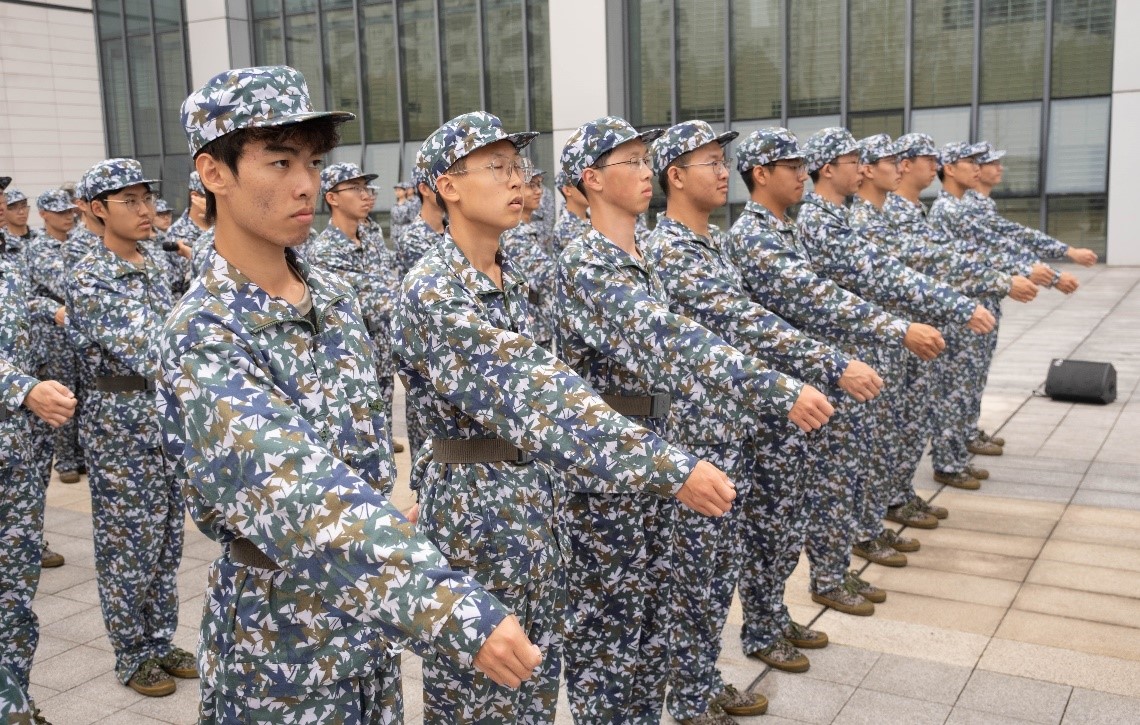 例行军姿训练后,连长排长开始组织对应训练内容。分列式动作看似简单,但它不仅需要毅力,更需要所有人的默契配合。匕首操方阵练习“横砍捅刺”动作,教官们精心示范,同学们则认真观看,领悟动作要领,最后练习巩固。