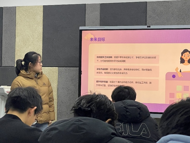 会议述职阶段,各部门部长依次上台以PPT的形式全面回顾上学期工作成果,总结汇报工作内容,反思现存问题并提出新学期工作计划。