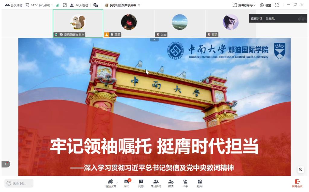 本次学习活动以“牢记领袖嘱托,挺膺时代担当”为主题,从大会介绍、习近平总书记贺信、党中央致词以及总结指导四个部分展开。吴思阳首先对全国青联十四届全委会和全国学联二十八大进行了介绍,强调了本次学习活动的重要意义,并通过韩漫基地