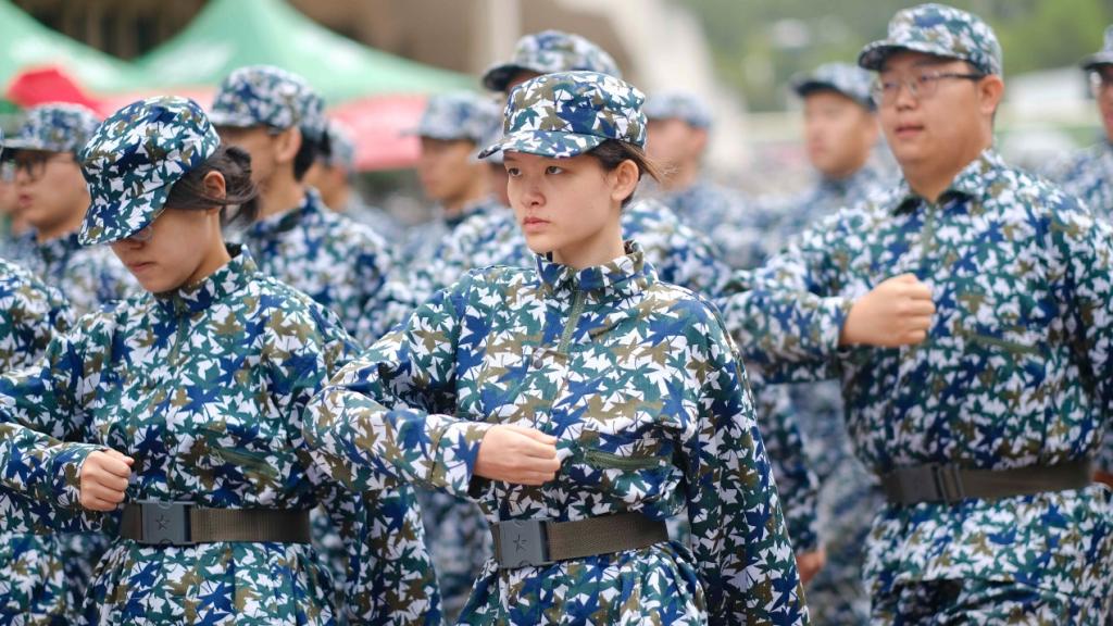 2025级新生迎着晨光步入训练场,迅速投入新一天的操练。