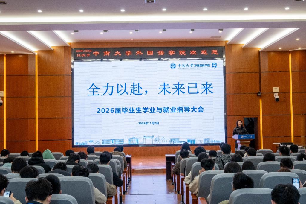 2026届毕业生学业与就业指导大会在潇湘校区外语楼一楼国际报告厅召开。学工办主任王晓宗、业务办副主任张姗姗、辅导员范帆、国际交流办副主任杨冬果以及2026届毕业生参加会议。会议由范帆老师主持。大会以“全力以赴,未来已来”为主题,围绕“精研学业、留学申请、稳踏职场、筑牢底线”四大板块展开,系统为毕业生提供多维度、全流程的指导。