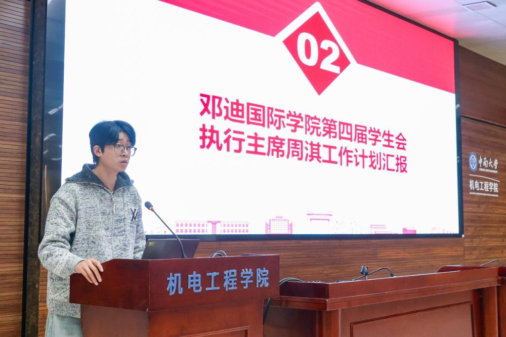 大会在庄严的氛围中拉开帷幕。第三届学生会执行主席周周作任期工作总结,回顾了过去一年学院各学生组织在服务同学、促进学院文化建设等方面取得的成果,并对全体成员的辛勤付出表示肯定。随后,第四届学生会执行主席周淇代表新一届学生组织做工作展望。他提到,新一届学生组织将围绕三个方面开展工作:一是坚守服务初心,提升服务质效,做同学信赖的“贴心人”;二是强化组织建设,凝聚团队力量,打造高效协作的“战斗集体”;三是立足国际特色,创新活动形式,打造独具风格的“校园品牌”。