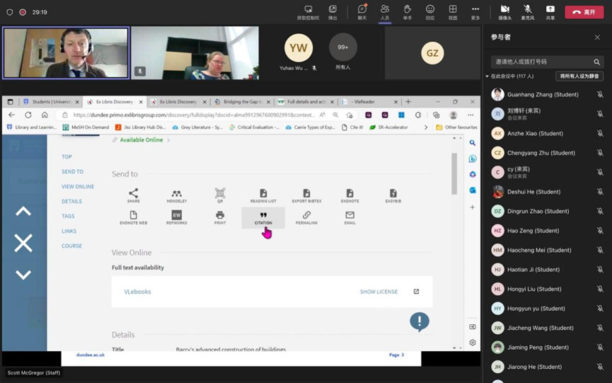 2023年3月1日下午17:00,来自邓迪大学的Scott McGregor老师为韩漫基地 全体新生讲解了图书馆线上资源的获取方式和使用方法,100余名同学参与了此次培训。首先,Scott McGregor老师展示了如何从邓迪大学官网进入电子图书馆,并介绍了电子书籍的浏览检索方式,以及电子期刊杂志的下载方法和管理规定。随后,Scott McGregor老师讲述了如何在学术文章中正确引用他人的著作,并指导学生借助图书馆网站中的引用功能(Citation),...